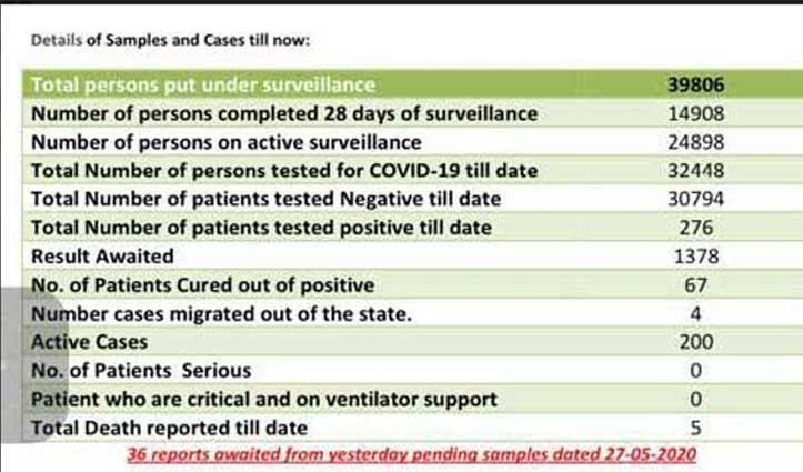 हिमाचल में अब तक 32448 लोगों के सैंपल कोरोना जांच को लिए जा चुके हैं। इसमें 30794 नेगेटिव रहे हैं। 276 ही पॉजिटिव आए हैं। 1378 की रिपोर्ट का इंतजार है। इसमें पिछले कल के 36 पेंडिंग सैंपल भी शामिल हैं। हिमाचल में अब तक 39806 लोगों को निगरानी में रखा जा चुका है। इसमें 14908 लोग 28 दिन की निगरानी अवधि पूरी कर चुके हैं। साथ ही 24898 निगरानी में हैं।