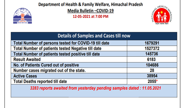 हिमाचल प्रदेश में कोरोना संक्रमण ( Corona infection) की दूसरी लहर जानलेवा हो गई है। आज यानी बुधवार की बात करें तो रिकॉर्ड 66 लोगों की मृत्यु हुई है। ये एक दिन में मौत का सबसे बड़ा आंकड़ा है। आज प्रदेश भर से 4977 मामले सामने आएं है। इसके साथ ही कुल संक्रमित मामलों की संख्या 1,45,736 हो गई है और 38954 मामले एक्टिव(Active) है। वहीं, 2,187 कोरोना पॉजिटिव (Corona Positive)ठीक हुए हैं। कोरोना डेथ (Corona Death) का आंकड़ा 2055 पहुंच गया है। जिला स्तर की बात करें तो कांगड़ा (Kangra) में 1419, मंडी में 1167 , सोलन में 408 , बिलासपुर में 352 , हमीरपुर में 377, चंबा में 308 , सिरमौर में 364, ऊना में 229, शिमला में 181 , कुल्लू में 105 , किन्नौर में 42 व लाहुल स्पीति में 25 मामले आए हैं।