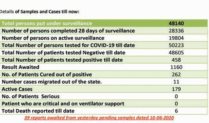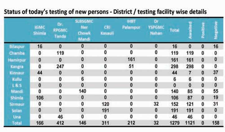हिमाचल में अब तक 1279 सैंपल जांच को आए हैं। इसमें 158 नेगेटिव रहे हैं। 1121 की रिपोर्ट का इंतजार है। आज के सैंपल से अब तक कोई पॉजिटिव मामला नहीं है। जो पॉजिटिव (Positive) मामले सामने आए हैं वह पिछले कल के पेंडिंग सैंपल से हैं। पिछले कल के 39 सैंपल की रिपोर्ट का भी इंतजार है। हिमाचल में अब तक 50223 लोगों के सैंपल कोरोना जांच को लिए जा चुके हैं। इसमें 48605 की रिपोर्ट नेगेटिव पाई गई है। 458 ही पॉजिटिव पाए गए हैं। वहीं, 48140 लोगों को निगरानी पर रखा जा चुका है। इसमें 28336 लोग 28 दिन का निगरानी पीरियड पूरा कर चुके हैं। 19804 अभी निगरानी में हैं।