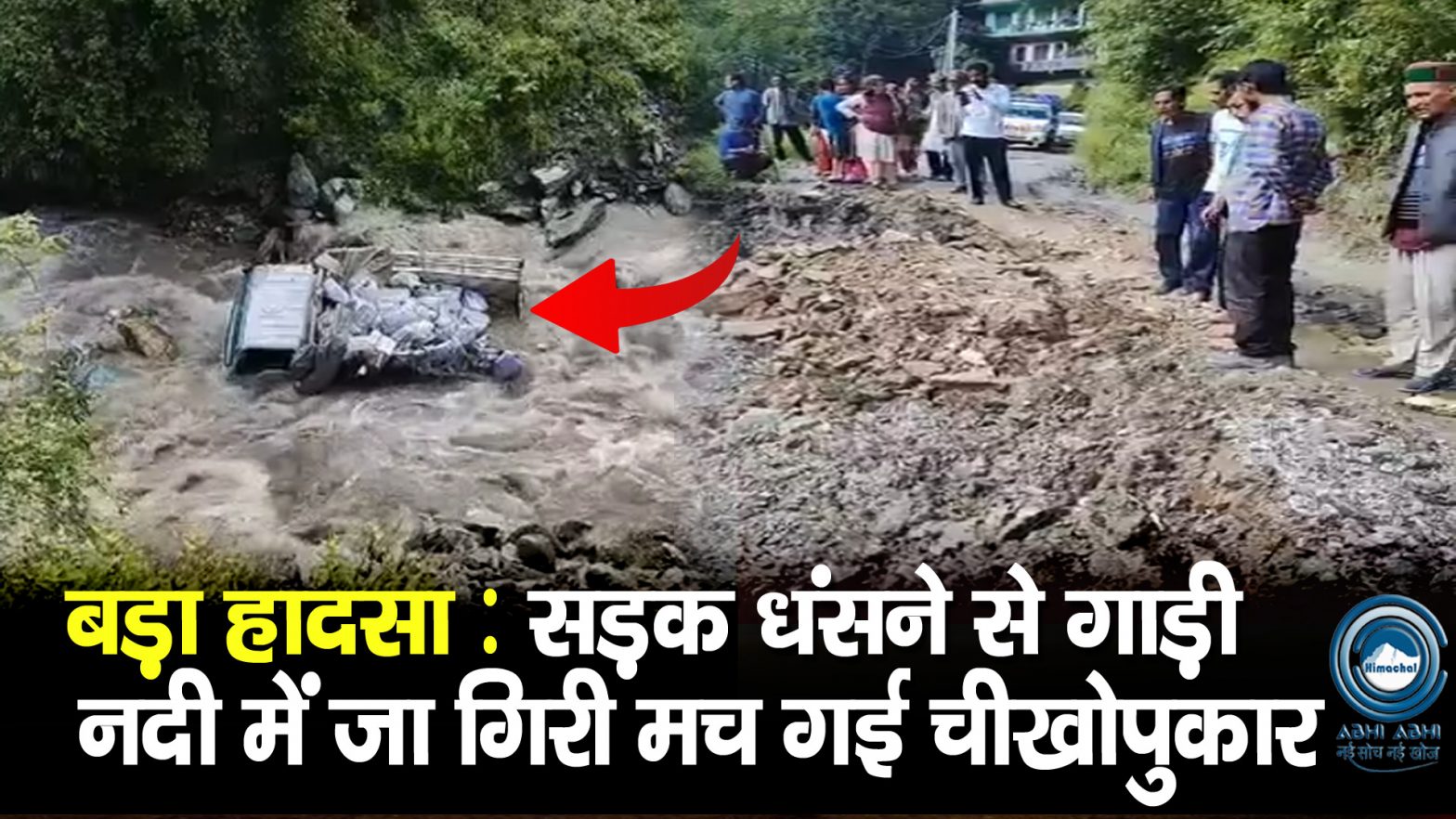 बंजार जीभी बायपास रोड में सड़क धंसने से नाशपाती की गाड़ी सीधे नदी में जा गिरी । चालक का पता अभी नहीं चल पाया।