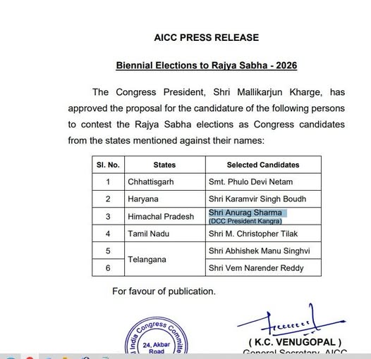Congress Candidate For Rajya Sabha: हिमाचल से राज्यसभा की एक सीट के लिए कांग्रेस ने हिमाचल से अपना कैंडिडेट घोषित कर दिया है। कांग्रेस के नाम ने सब को चौंका दिया है। कांग्रेस हाई कमान ने जिला कांगड़ा के अध्यक्ष अनुराग शर्मा के नाम पर मुहर लगाई है। हाईकमान ने आज सुबह 5 राज्यों में 6 उम्मीदवारों के साथ अनुराग के नाम की भी घोषणा कर दी।