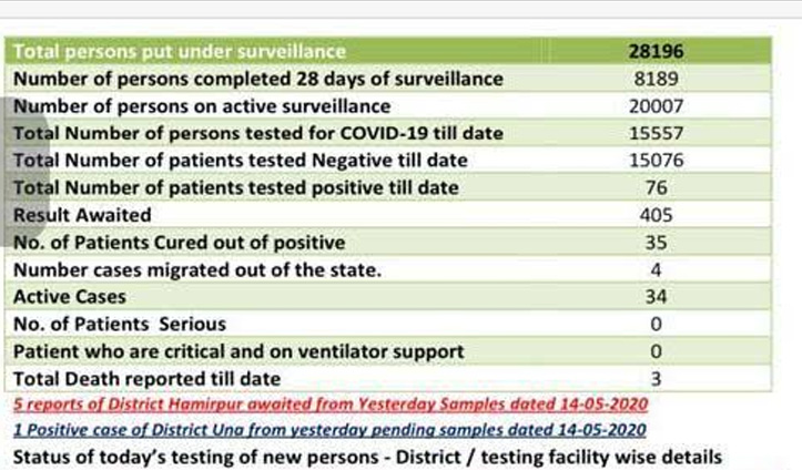 हिमाचल में अब तक 15557 लोगों के सैंपल कोरोना (Corona Sample) जांच के लिए लिए जा चुके हैं। इसमें 76 नेगेटिव पाए गए हैं। अभी 405 की रिपोर्ट आनी बाकी है। इसमें पांच 14 मई के हमीरपुर जिला के पांच सैंपल पेंडिंग हैं। आज के 400 सैंपल पेंडिंग हैं। हिमाचल (Himachal) में अब तक 28196 लोगों को निगरानी में रखा जा चुका है। इसमें 8189 लोग 28 दिन की निगरानी अवधि पूरी कर चुके हैं। साथ ही 20007 लोग अभी निगरानी में हैं। हिमाचल में कोरोना का आंकड़ा 76 पहुंच गया है। इसमें 34 एक्टिव केस हैं। साथ ही 39 लोग (चार हिमाचल के बाहर चले गए सहित) ठीक हो चुके हैं। तीन की मौत हुई है।