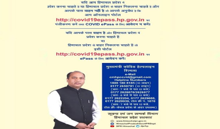 शिमला। अगर कोई हिमाचल में प्रवेश करना चाहता है या फिर हिमाचल से बाहर निकलना चाहता है और उसके पास वाहन नहीं है तो वह Covid epass पास के लिए आवेदन ना करें। ऐसे लोग ऑनलाइन पोर्टल http://covid19epass.hp.gov.in पर पंजीकरण करवाएं। यदि आपके पास वाहन है और हिमाचल में प्रवेश करना चाहते हैं या हिमाचल से बाहर निकलना चाहते हैं तो इसी पोर्टल http://covid19epass.hp.gov.in पर epass के लिए आवेदन करें। अधिक जानकारी के लिए आप इन नंबरों पर संपर्क कर सकते हैं।