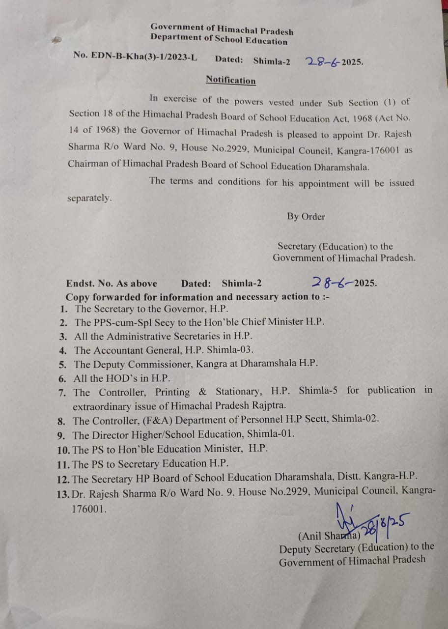 HPBOSE: हिमाचल सरकार ने डॉ राजेश शर्मा को हिमाचल प्रदेश स्कूल शिक्षा बोर्ड का चेयरमैन नियुक्त किया है। इस संबंध में सरकार की ओर से नोटिफिकेशन जारी हो गई है। डॉ राजेश शर्मा ने इस जिम्मेदारी के लिए सीएम सुखविंद्र सिंह सुक्खू का तहेदिल से आभार जताया है।