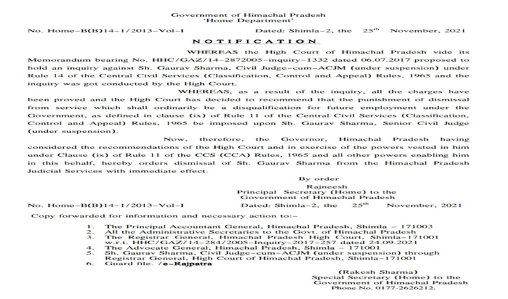हिमाचलः 40 हजार रिश्वत लेते पकड़े गए पूर्व जज गौरव शर्मा बर्खास्त, पढ़े पूरा मामला