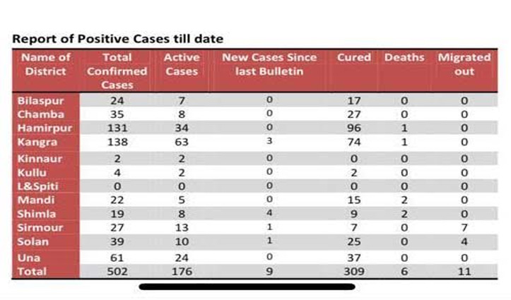 शिमला। हिमाचल में कोरोना (Corona) का आंकड़ा 500 पार हो गया है। हिमाचल (Himachal) में आज आए नए 16 मामलों के साथ कुल मामले 502 हो गए हैं। वहीं, आज 16 लोग ठीक हुए हैं। हिमाचल में आज कांगड़ा जिला से 10, शिमला से चार, सिरमौर और सोलन से एक-एक मामला सामने आया है। वहीं, बिलासपुर का एक, चंबा के दो, हमीरपुर के चार, कांगड़ा के तीन, मंडी के दो, सिरमौर के तीन व ऊना जिला का एक कोरोना पॉजिटिव (Corona Positive) ठीक हुआ है। हिमाचल में अब एक्टिव केस 176 हो गए हैं। अब तक 313 लोग ठीक हुए हैं। इनमें चार हिमाचल के बार चले गए चार लोग भी शामिल हैं, जोकि दिल्ली के एक अस्पताल में इलाज करवाकर ठीक हुए हैं। इनके सैंपल सोलन जिला के खाते में थे। हिमाचल में अब तक 6 की मृत्यु हुई है।