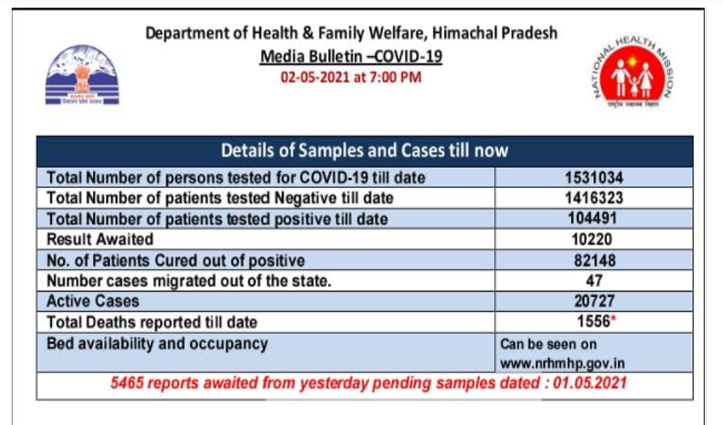 हिमाचल में आज 7,860 सैंपल में से 2,266 नेगेटिव, 839 पॉजिटिव