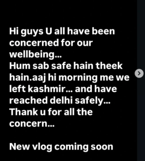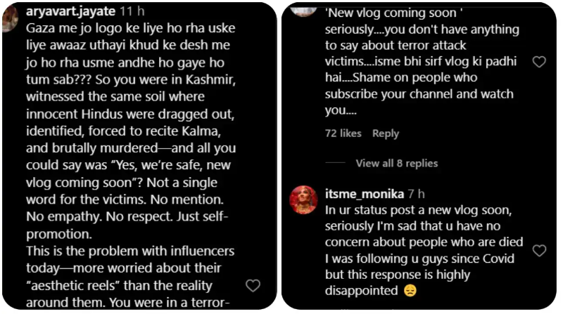 एक यूजर ने लिखा, “वाह! आप लोगों को शर्म नहीं आती? 25 से ज्यादा हिंदू मारे गए हैं और आप लोगों का मैसेज केवल इस बारे में है कि आपका व्लॉग जल्द आ रहा है। आतंकी देश को बढ़ावा देते रहें, उनके ड्रामा, खाने, संस्कृति और पूरे परिवार को, लेकिन कमाओ और रहो भारत में।”