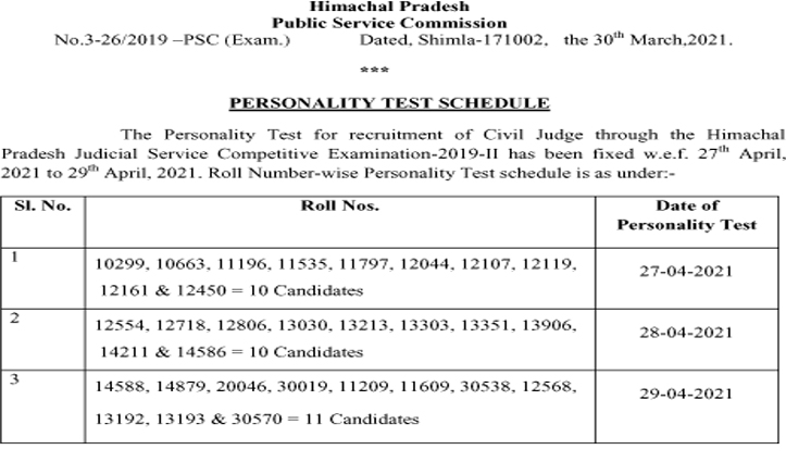 शिमला। हिमाचल लोक सेवा आयोग (HPPSC) ने सिविल जज (Civil Judge) के पदों को भरने के लिए आयोजित हिमाचल हिमाचल प्रदेश न्यायिक सेवा प्रतियोगी परीक्षा-2019-2 (Himachal Pradesh Judicial Service Competitive Examination-2019-II) के पर्सनालिटी टेस्ट का शेड्यूल जारी कर दिया है। यह पर्सनालिटी टेस्ट 27 अप्रैल से 29 अप्रैल तक आयोजित होगा।