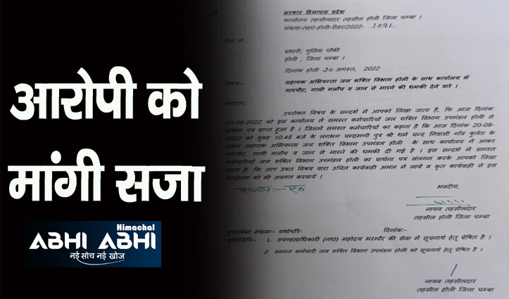 नूरपुर कनिष्ठ अभियंता संघ के अध्यक्ष पंकज कौशल (Pankaj Kaushal) ने प्रशासन को चेताया कि अगर इस मामले में उचित कार्रवाई न की गई तो कनिष्ठ अभियंता संघ अपना काम नहीं करेगा। इसकी सारी जिम्मेदारी सरकार और प्रशासन की होगी। शनिवार को सहायक अभियंता जल शक्ति विभाग उपमंडल होली के समस्त कर्मचारियों ने तहसीलदार होली को एक शिकायत पत्र दिया है। इसमें लिखा गया है कि शनिवार साढ़े दस बजे चंद्रमणि पुत्र धर्म चंद वासी गांव कुलेठ ने सहायक अभियंता से कार्यालय में मारपीट कर गाली-गलौज किया। आरोपी ने उन्हें जान से मारने की धमकियां भी दीं। शिकायत पत्र मिलने के बाद तहसीलदार ने पुलिस चौकी होली के प्रभारी को उचित कार्रवाई करने के आदेश दिए हैं। वहीं उन्होंने एसडीएम भरमौर (SDM Bharmour) को भी एक लिखित शिकायत दी है।