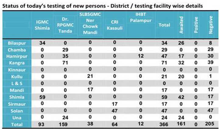 आज कोरोना जांच के लिए 366 सैंपल लिए गए हैं। इसमें 205 अभी तक नेगेटिव रहे हैं।