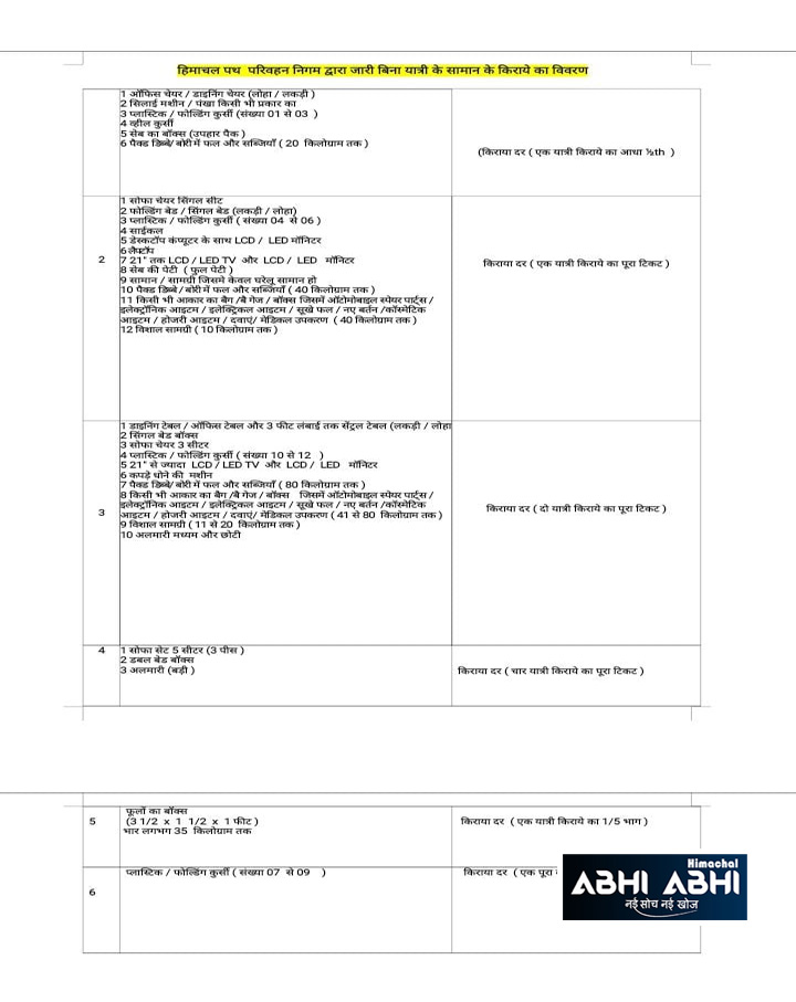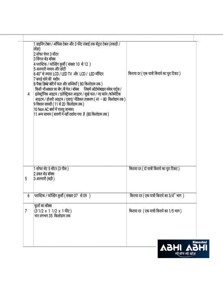 हिमाचल पथ परिवहन निगम की बसों (Himachal Road Transport Corporation Buses) में कोई भी सवारी (Passenger) अपने साथ क्या सामान फ्री (Free) में ले जा सकती है। इसको लेकर पिछले कुछ दिनों से ऊहापोह की स्थिति बनी हुई थी। अब एचआरटीसी ने इसके लिए बाकायदा एक लिस्ट (List) जारी की है। इस लिस्ट से पता चल जाता है कि एचआरटीसी की बसों (HRTC Buses) में क्या सामान फ्री में ले जा सकते हैं। इसके साथ ही एचआरटीसी ने नई सामान की दरों (New Rates) का विवरण भी इस लिस्ट के साथ जारी किया है।